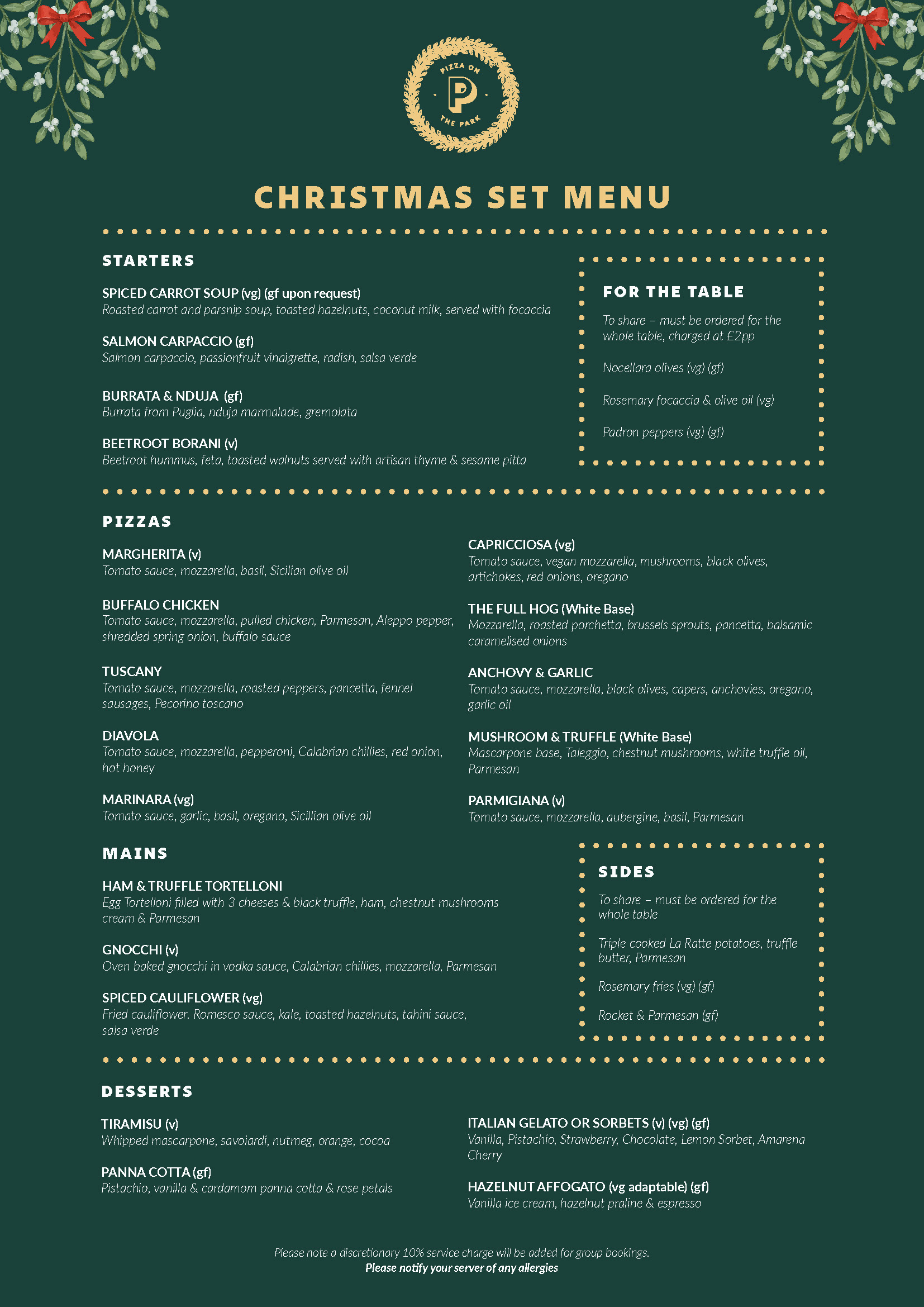We’ve created something that is truly unique in Bristol, and offers a delicious alternative to the traditional Christmas meal. Rather than yet another rushed roast, why not try something a bit different this Christmas? Host your party with us and enjoy your favourite Italian classics with that special Pizza on the Park Christmas twist and plenty of Chrimbo cocktails!